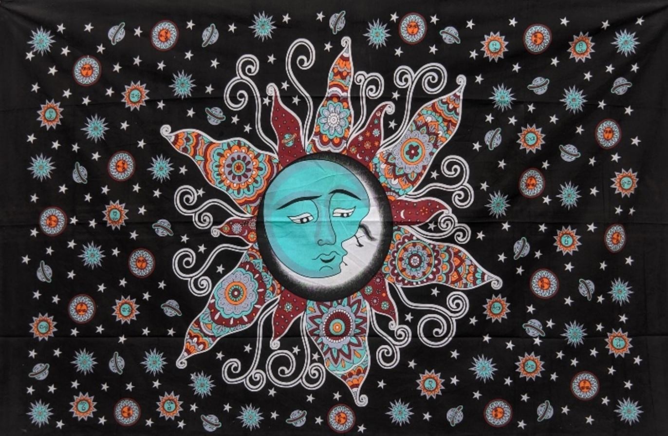 Celestial Sun Moon Star Horizontal Hang Wall Hanging Handmade Cotton Tapestry 84″ x 54″ inch